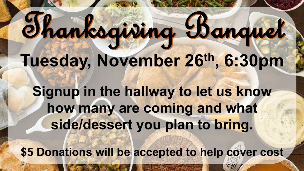 Signup in the church hallway to let us know how many are coming and what side or dessert you are bringing